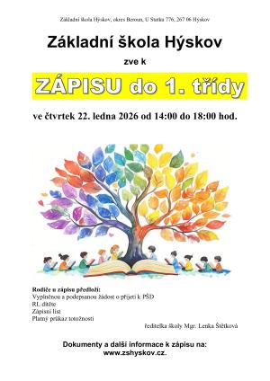 22.1.2026 se koná Zápis do 1. třídy od14:00 do 18:00 hod