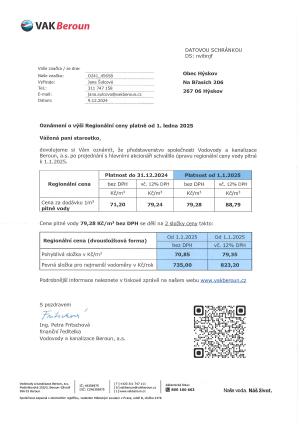 Oznámení o výši Regionální ceny vodného a stočného platné od 1. ledna 2026