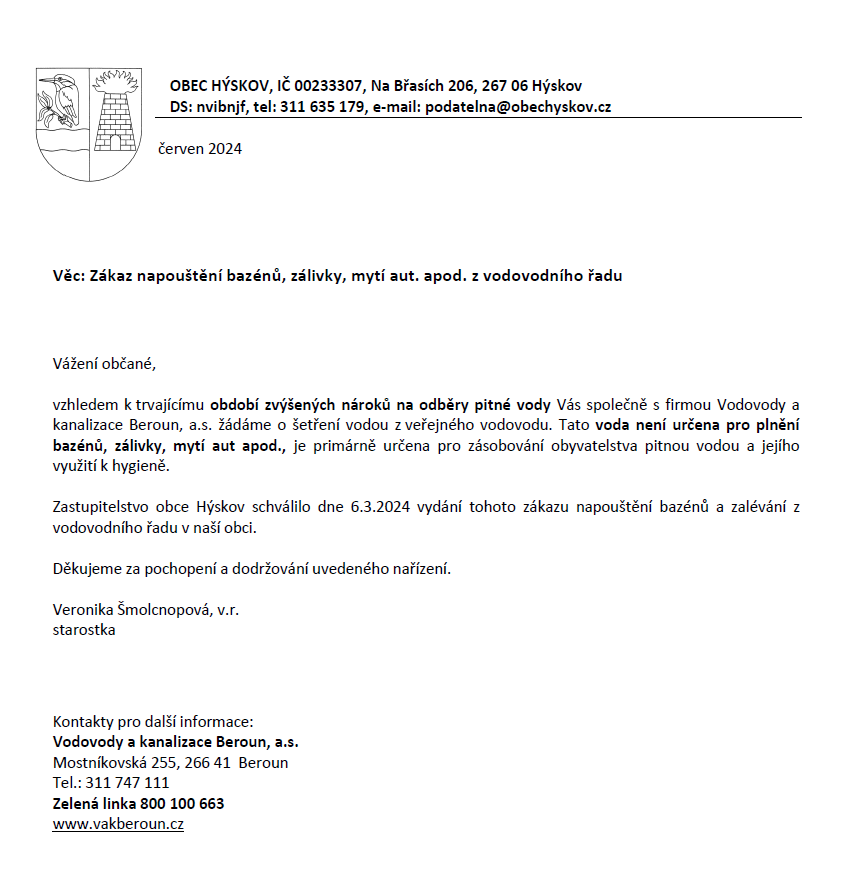 Zákaz napouštění bazénů, zálivky, mytí aut apod. z vodovodního řádu
